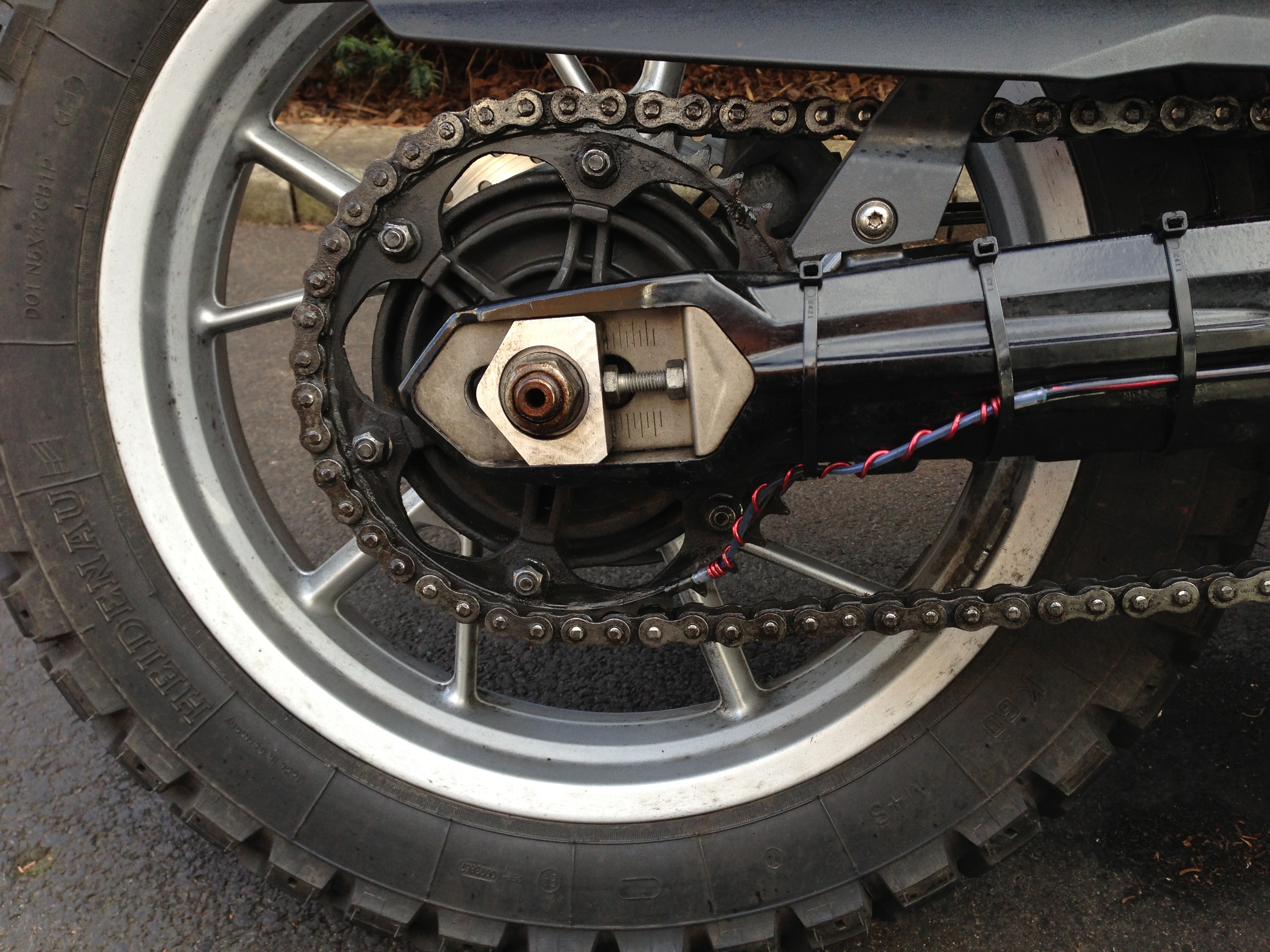Thinking outside the box, I’m going to try to get something like a wired coat hanger (or look for more ‘flexible and memorable’ metal-type wiring) and replace the OEM spiral with that. After a kind technician at the local dealership saw what was going on, he/she kindly soldered(?) the final ‘twist’ of the delivery tube/sprial wiring before the end point made contact with the rear sprocket (so that the fluid gets delivered at the right point, each time and every time). That seemed to hold the delivery tube in place quite well. However, with recent rideouts, the ‘soldered’ reinforcement broke off and now I’m having the same issues of the tube flaying around everywhere.